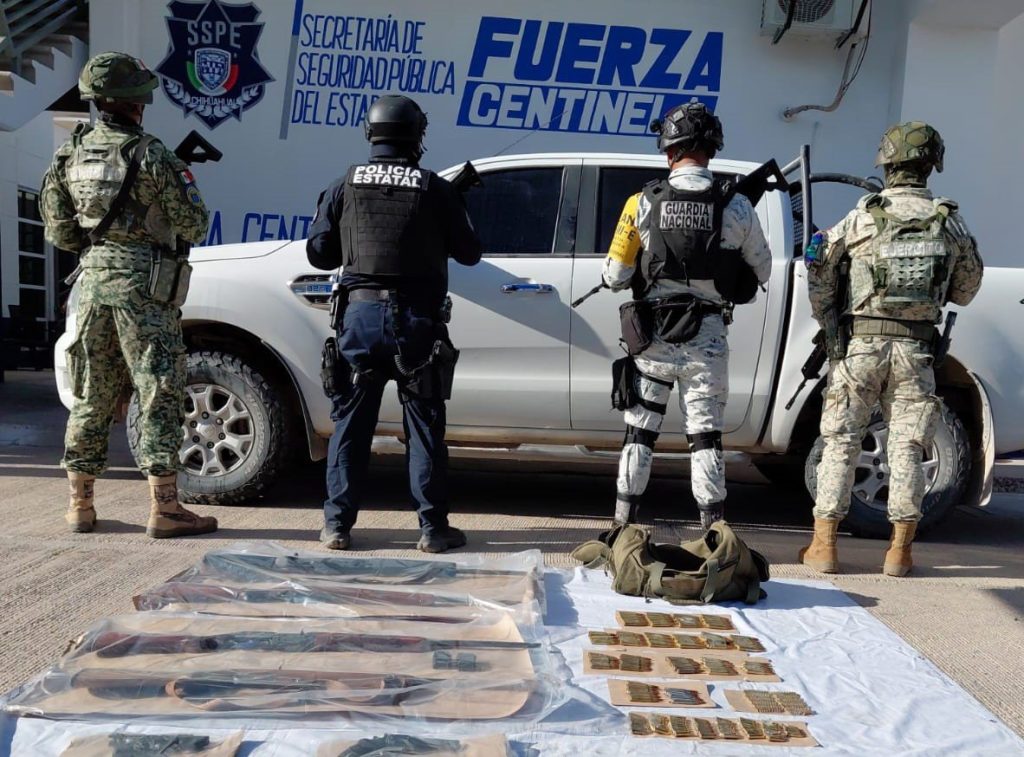 Guardia Nacional y Ejército aseguran rifles, armas cortas y cartuchos en vehículo robado en Aldama