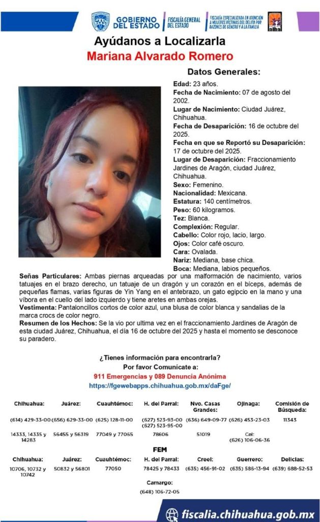 Publicidad Ciudad Juárez, Chihuahua. — Autoridades y familiares de Mariana Alvarado Romero, de 23 años, solicitan la colaboración de la ciudadanía para localizar a la joven, quien fue vista por última vez el pasado 16 de octubre de 2025 en el fraccionamiento Jardines de Aragón, al norte de Ciudad Juárez. La desaparición fue reportada oficialmente […]