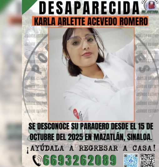 Publicidad Karla Arlette Acevedo Romero, una joven de 20 años y estudiante de medicina, fue reportada como desaparecida en Mazatlán, Sinaloa, desde la tarde del miércoles 15 de octubre de 2025. La comunidad universitaria y autoridades locales mantienen activa su búsqueda. De acuerdo con la información proporcionada, la joven salió de clases en la Universidad […]