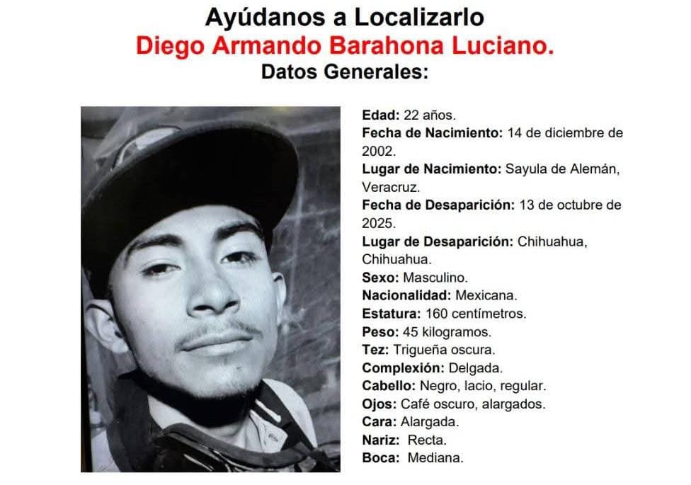 Publicidad H. Cd de Chihuahua.- La Fiscalía del Estado pide ayuda para encontrar a Diego Armando Barahona Luciano, de 22 años, quien desapareció el 13 de octubre de 2025 después de salir de la Dirección de Seguridad Pública Municipal (Sur). Diego no puede hablar ni escuchar, por lo que su familia y las autoridades están […]