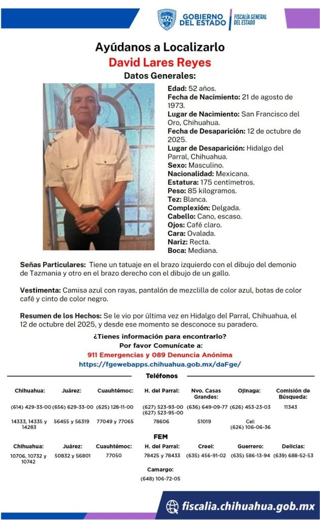 La Comisión de Búsqueda de Personas del Estado de Chihuahua emitió una pesquisa para localizar a David Lares Reyes, de 52 años de edad, quien fue visto por última vez el 12 de octubre de 2025 en Hidalgo del Parral, sin que hasta el momento se tenga información sobre su paradero.