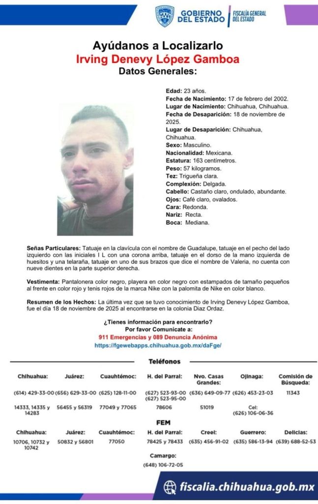 Publicidad Autoridades y familiares solicitan la colaboración de la ciudadanía para localizar a Irving Denevy López Gamboa, de 23 años, cuya desaparición fue reportada el pasado 18 de noviembre de 2025 en la ciudad de Chihuahua. De acuerdo con la información proporcionada, Irving nació el 17 de febrero de 2002 en Chihuahua. Es de nacionalidad […]