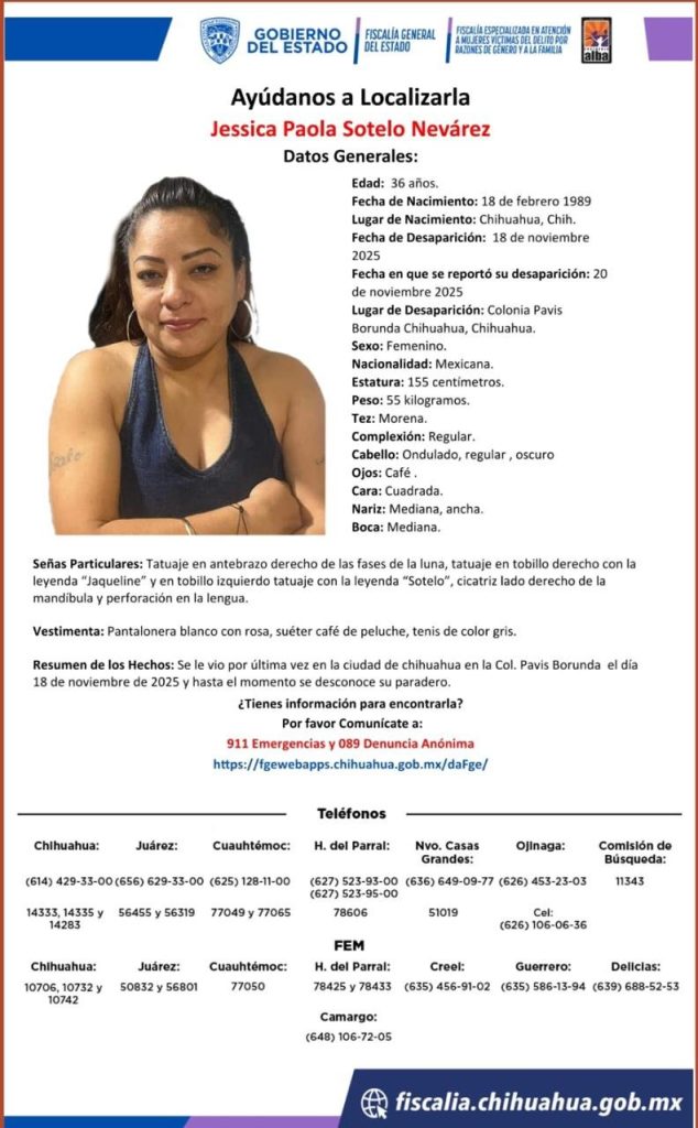 Publicidad La Fiscalía General del Estado solicita el apoyo de la ciudadanía para localizar a Jessica Paola Sotelo Nevárez, de 36 años, quien permanece desaparecida desde el pasado 18 de noviembre de 2025. De acuerdo con el reporte oficial, la mujer fue vista por última vez en la colonia Pavis Borunda, en la ciudad de […]