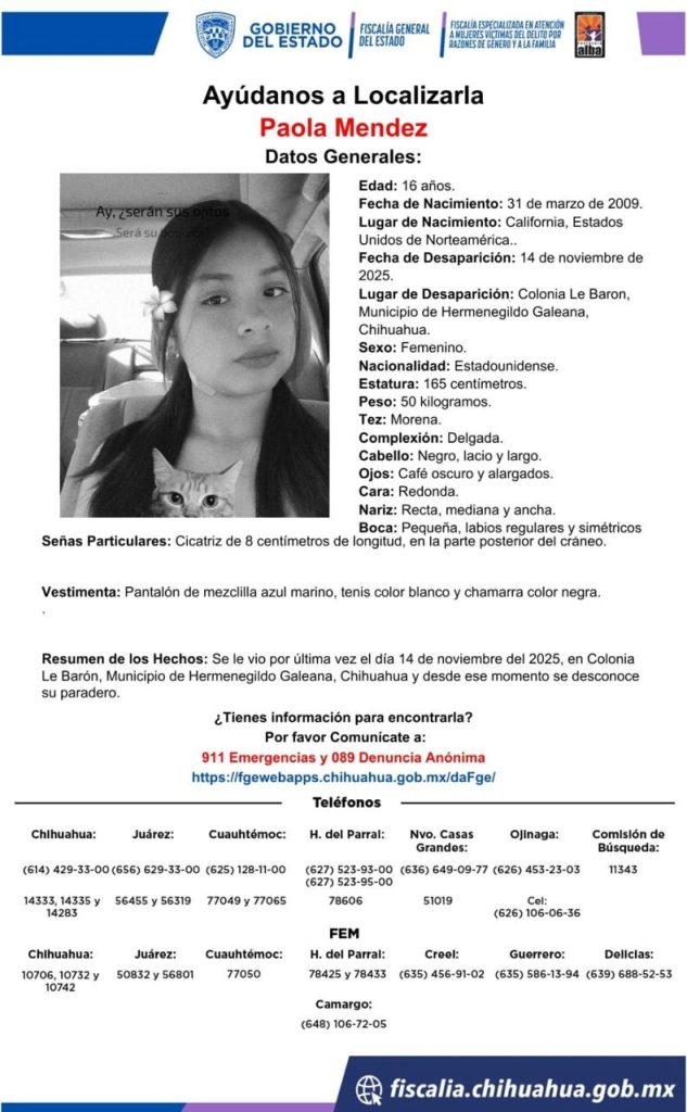 Publicidad H. Cd. de Chihuahua.- Autoridades de la FISCALÍA GENERAL DEL ESTADO emitieron una pesquisa para localizar a PAOLA MENDEZ, una adolescente de dieciséis años cuyo paradero se desconoce desde que salió de su domicilio en la colonia Le Barón, municipio de Hermenegildo Galeana. De acuerdo con la información oficial, la joven mide alrededor de […]