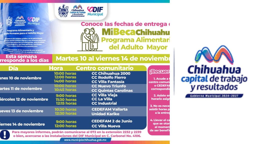 Publicidad H. Cd de Chihuahua.- El DIF Municipal, informa a las y los solicitantes del Programa Alimentario del Adulto Mayor (PAAM) los lugares donde podrán acudir por su paquete alimentario 10 al 14 de noviembre, en los siguientes centros comunitarios: 10 de noviembre: Chihuahua 2000, 10:00 horas Rodolfo Fierro, 12:00 horas Villa Fantasía, 14:00 horas […]