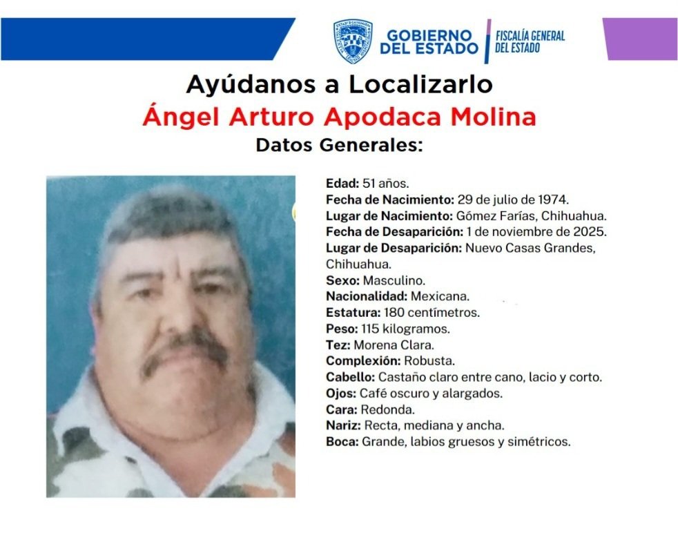 Publicidad Las autoridades y familiares solicitan la colaboración de la ciudadanía para localizar a Ángel Arturo Apodaca Molina, de 51 años de edad, quien fue visto por última vez el pasado 1 de noviembre de 2025 en el municipio de Nuevo Casas Grandes, Chihuahua. Desde entonces, se desconoce su paradero. De acuerdo con la información […]