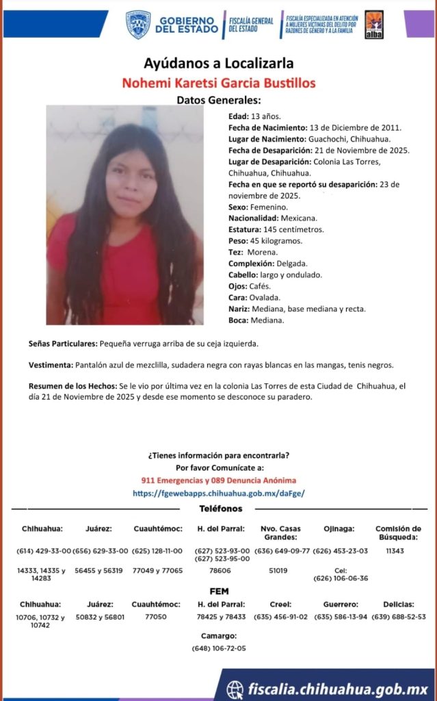 Publicidad La Fiscalía General del Estado de Chihuahua solicita la colaboración de la ciudadanía para localizar a Nohemi Karetsi García Bustillos, de 13 años de edad. De acuerdo con el reporte de ausencia, la menor fue vista por última vez el 21 de noviembre de 2025 en la Colonia Las Torres, en Guachochi, Chihuahua, y […]