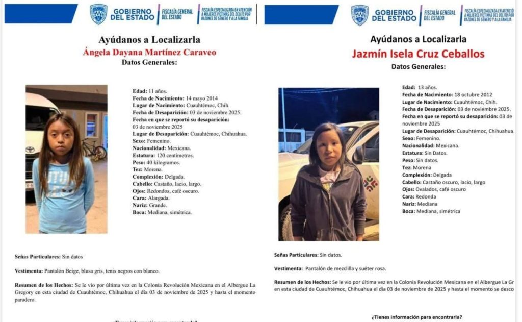 Buscan a dos menores desaparecidas en Cuauhtémoc; fueron vistas por última vez en un albergue