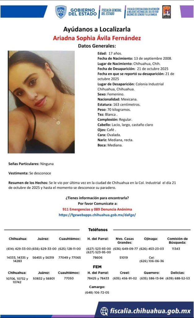 Publicidad Chihuahua, Chih.— Autoridades estatales activaron una pesquisa para localizar a Ariadna Sophia Ávila Fernández, una joven de 17 años de edad reportada como desaparecida el 21 de octubre de 2025 en la colonia Industrial, en la ciudad de Chihuahua. De acuerdo con la información emitida por la Fiscalía General del Estado (FGE), Ariadna Sophia […]