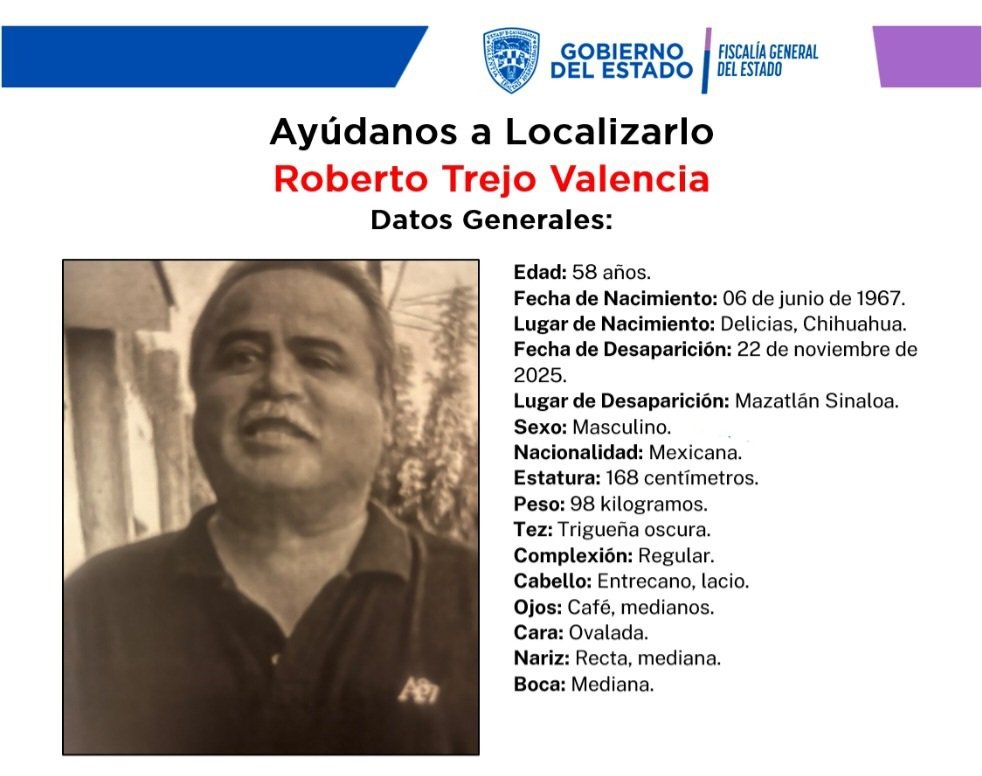 Publicidad Autoridades y familiares solicitan la colaboración de la ciudadanía para localizar a Roberto Trejo Valencia, de 58 años de edad, quien fue visto por última vez el pasado 22 de noviembre de 2025 en la ciudad de Mazatlán, Sinaloa, sin que hasta el momento se tenga información sobre su paradero. De acuerdo con el […]