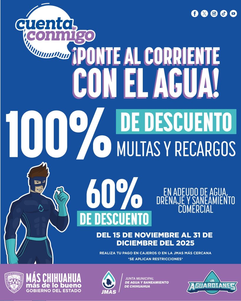 La Junta Municipal de Agua y Saneamiento (JMAS) de Chihuahua informó que este sábado 15 de noviembre, iniciará la implementación del programa “Ponte al Corriente con el Agua”, dirigido a los usuarios comerciales. Lo anterior, como parte de la segunda etapa de la estrategia que comenzó el pasado 1 de noviembre. El beneficio […]