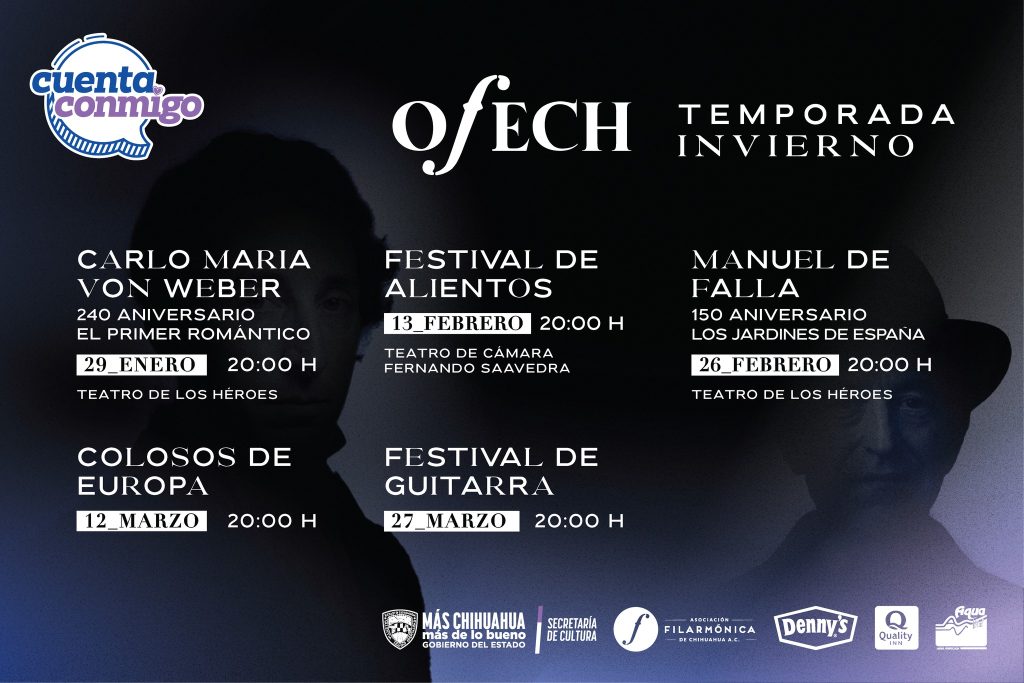 La Orquesta Filarmónica del Estado de Chihuahua (Ofech) anunció el inicio de su temporada de invierno 2026, que contempla presentaciones durante los meses de enero, febrero y marzo en distintos recintos de la ciudad de Chihuahua. El arranque formal es el 29 de enero a las 8:00 de la noche en el Teatro de […]