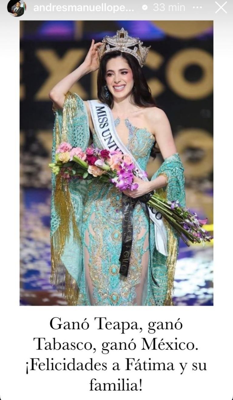 ¡Muchas felicidades, @bosch_fatima! En #Tabasco celebramos tu triunfo en Miss Universe 2025. pic.twitter.com/rJTJuYAMUY